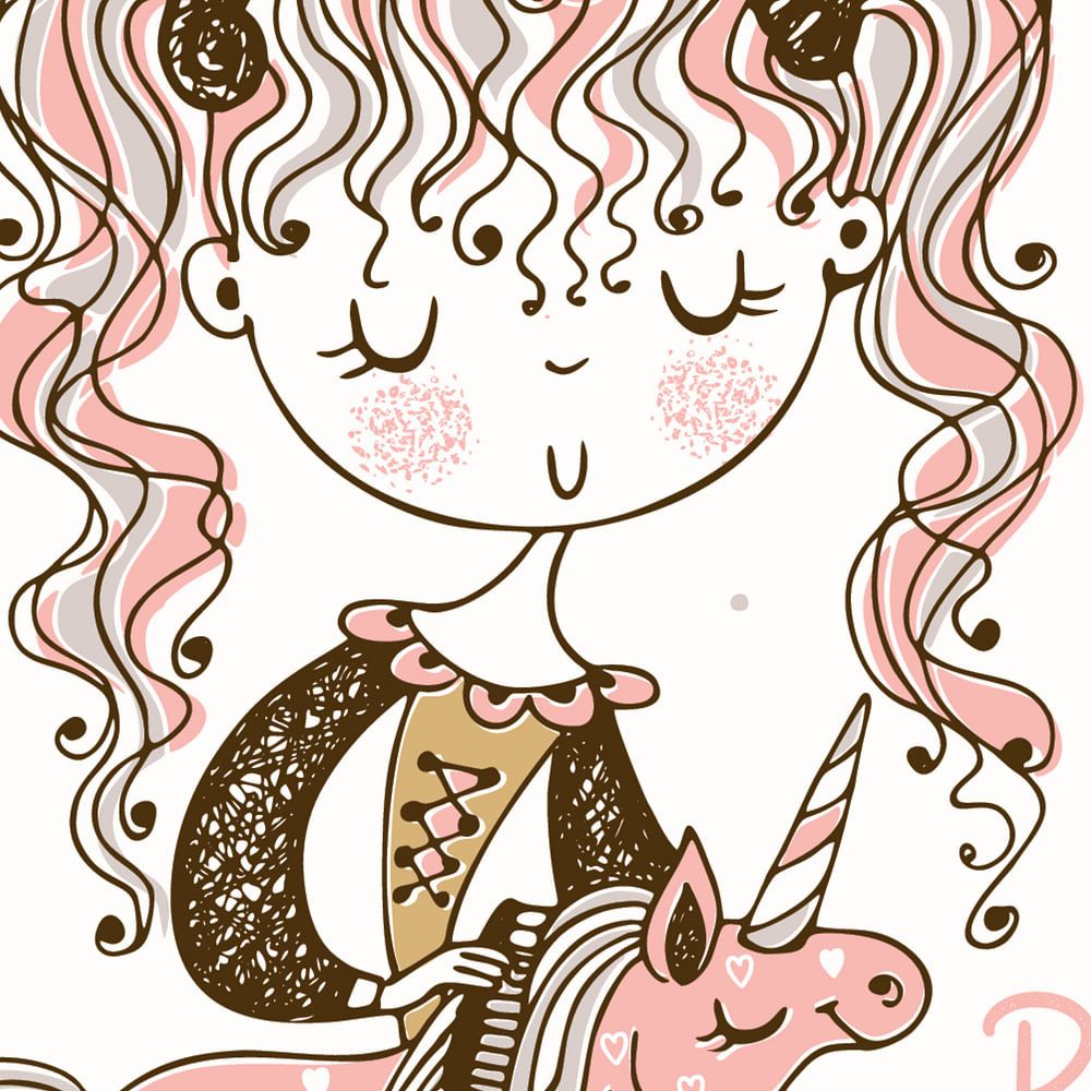 Zeichnung eines niedlichen Mädchens mit einem Pferd mit Horn, das eine Umarmung bekommt. Die Haare beider sind rosa und das Mädchen hat eine Krone auf. Es gibt einige süße Schmetterlinge, die herumfliegen.