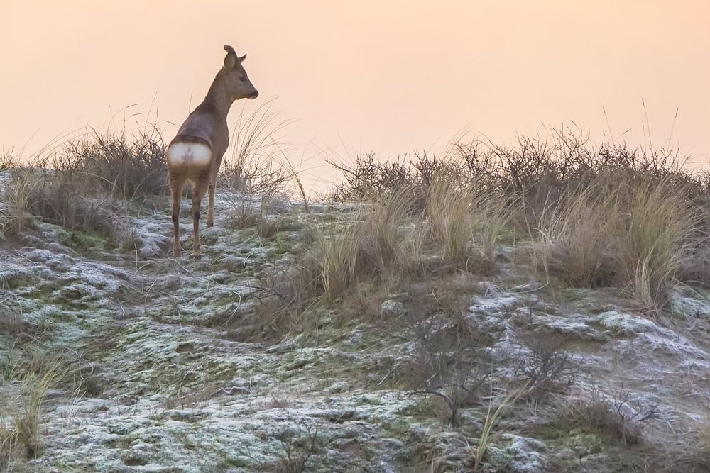 Ree im Naturgebiet Berkheide. Das Dünengebiet Berkheide zwischen Wassenaar und Katwijk hat viele schöne Flecken. Wenn das Sonnenlicht auf die Dünen trifft, ist es immer ein atemberaubendes Spektakel aus Licht und Stille. Die Dünen in der Ferne sind der Meeresstreifen mit dem Strand und dem Meer dahinter.