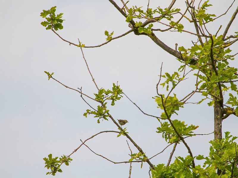 Hoch in einer Eiche, versteckt zwischen den Blättern, entdeckte ich diesen kleinen Vogel. Eine unscheinbare Erscheinung, aber schön in seiner Schlichtheit. Dieses Bild mit den gezackten Linien und dem kleinen Pfeifer, der sich elegant von der leichten Wolkendecke abhebt, erinnerte mich an japanische Grafik. Aber in niederländischer Natur.