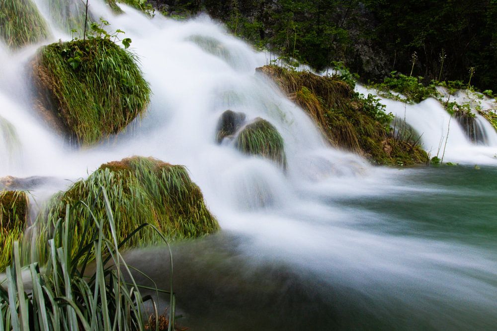 Kleiner Wasserfall in Kroatien. Plitvicer Seen. Mit viel Grün und dem hölzernen Steigrohr.
