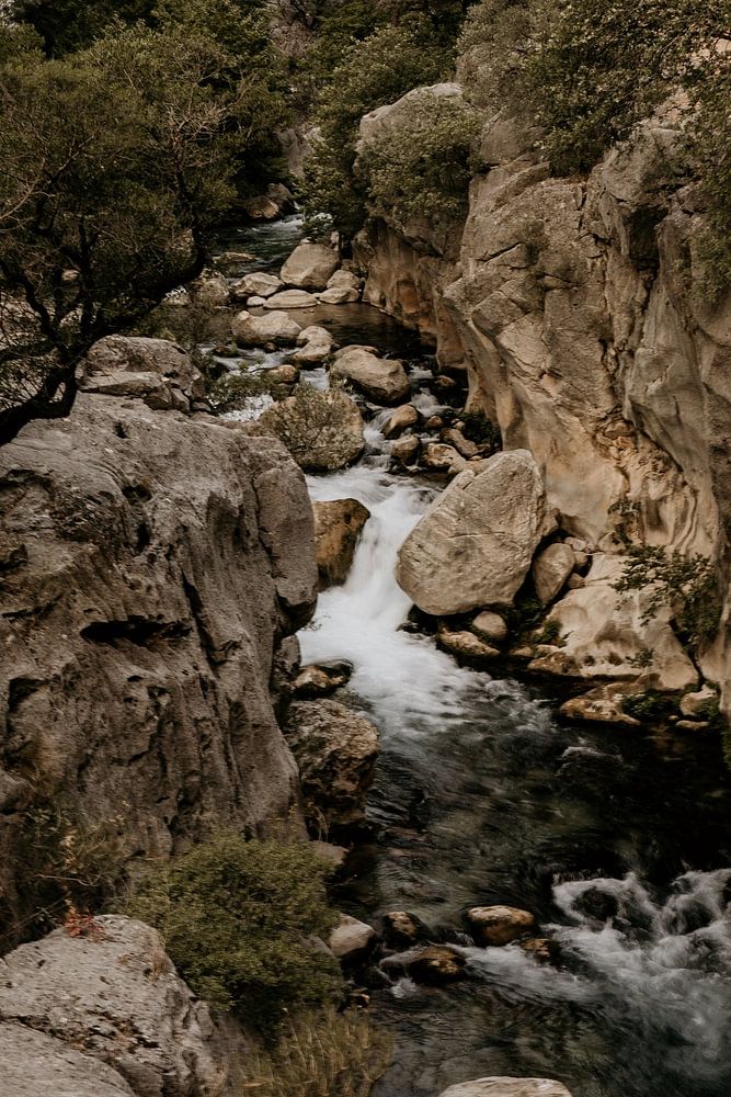 Gewundener Fluss mit kleinem Wasserfall in der bulgarischen Berglandschaft. Die Stimmung dieser Platte ist warm, stimmungsvoll und abenteuerlich.