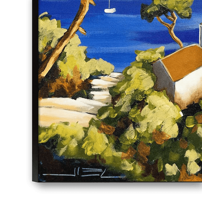 Eine kleine Gruppe weißer Häuser mit ocker-orangefarbenen Dächern liegt ruhig zwischen Pinien und Büschen, wie an die Klippe geschmiegt. Man erreicht sie über einen hellen Pfad, der sich sanft zwischen den Schatten der Pflanzen und der Wärme der Steine hindurchschlängelt. Unterhalb des Weges breitet sich das Meer mit seinem tiefen, lebendigen Blau aus, das hier und da von weißen Segelbooten durchbrochen wird, die in der Stille zu schweben scheinen.