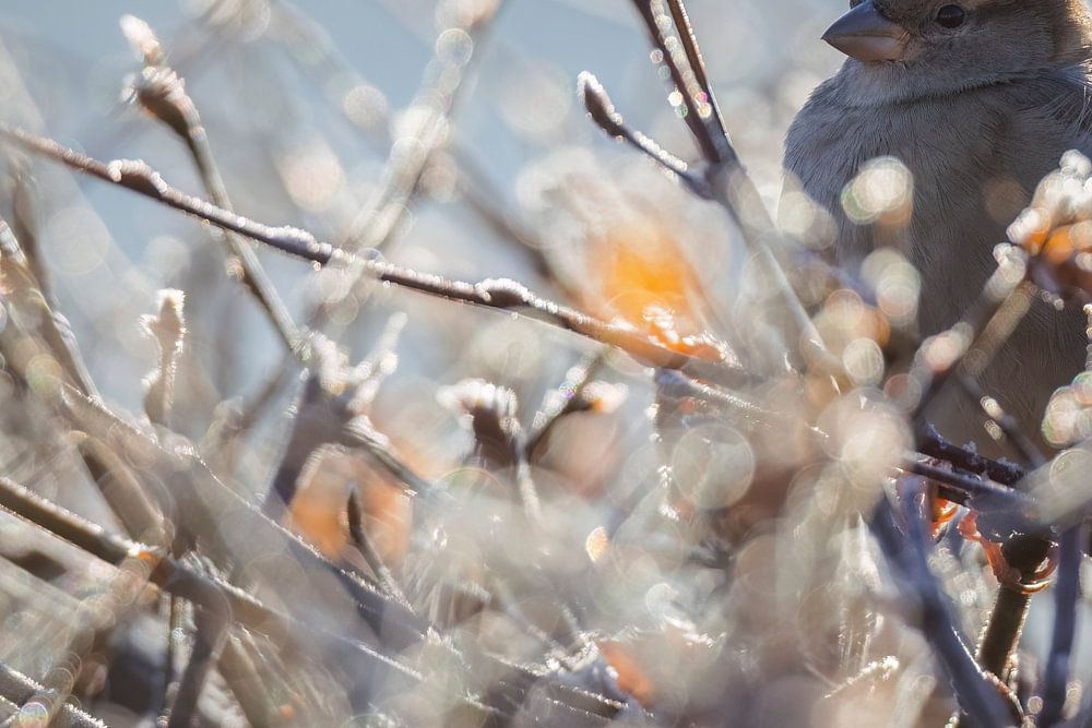 Der kleine süße Spatz sitzt in der mit Reif bedeckten Hecke und genießt die ersten wärmenden Sonnenstrahlen.