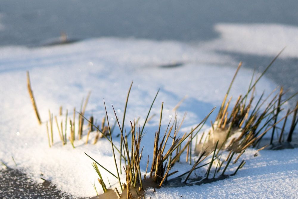 Die Aufmerksamkeit wird auf einen kleinen Grasfleck in einer weiten Schneelandschaft gelenkt. Die kräftigen Farben des Schnees und des Eises bei Sonnenaufgang schaffen einen ruhigen Eindruck.