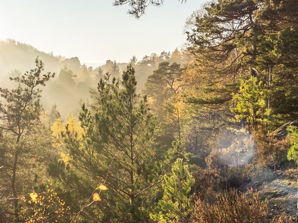 Neben Papststein und Gohrisch ist der Kleinhennersdorfer Stein ein weniger bekanntes doch gleichwohl lohnendes Ausflugsziel. Das Bild zeigt, wie sich auch hier Wälder entlang von Felskanten lichten, wie die Bäume den Blick freigeben auf die wunderschöne Umgebung und einen herbstgoldenen Sonnenuntergang.