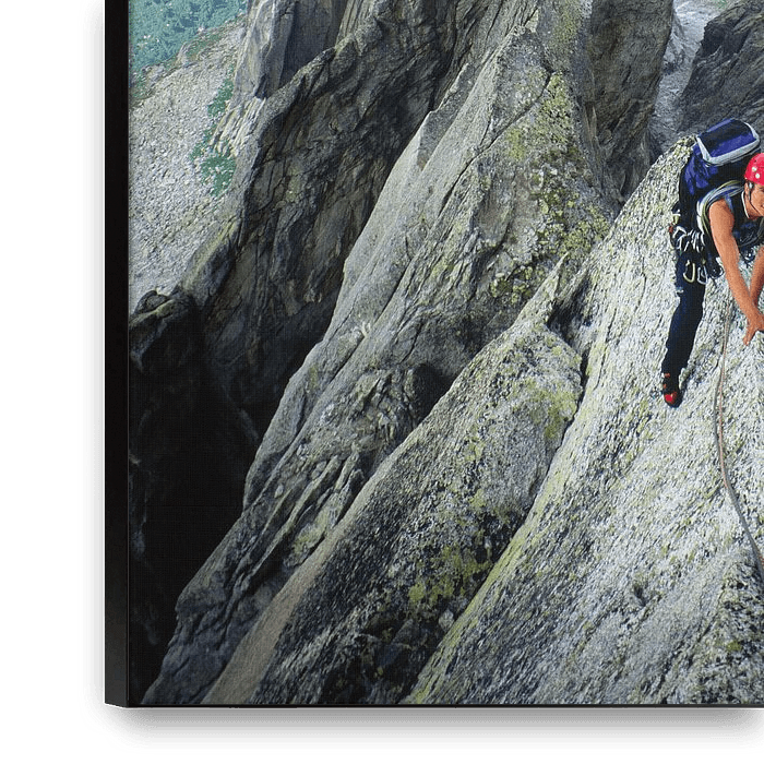 Ein Kletterer sucht nach einem Griff im Granit des Salbit-Westgrats, einer berühmten Kletterroute in den Schweizer Alpen.