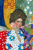 Gemälde einer Frau mit Rosen als Ohrringe. Dieses Werk basiert auf Klimt. Dieses Porträt der jungen Dame hat viele fröhliche Farben und Blumen und Vögel in der Szene.