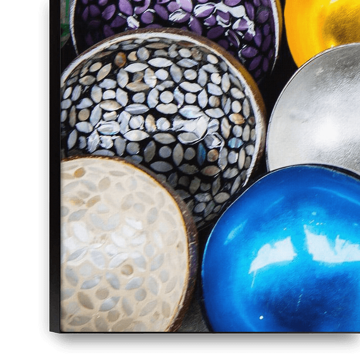 Tientallen kleurrijke schaaltjes om uit te kiezen. In Vietnam vind je ze op elke markt. Ze worden gemaakt van kokos en daarna gelakt .Oorspronkelijk werd het lakwerk gebruikt om kandelaren en vazen voor tempels mee te versieren.
