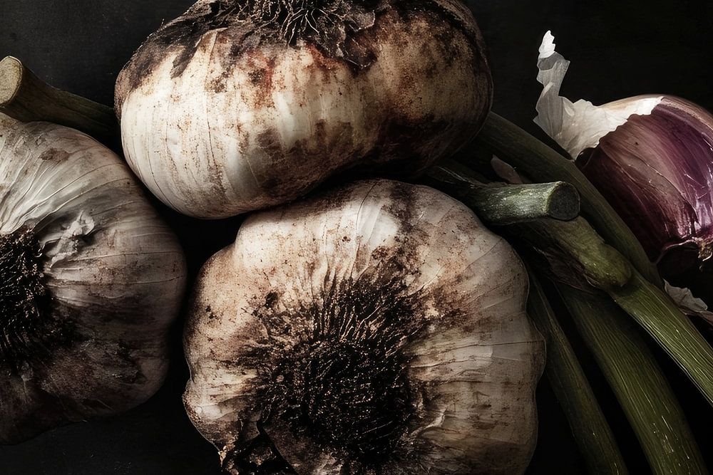 Ein prägnantes und erdiges Stillleben, in dem drei robuste Knoblauchzwiebeln im Mittelpunkt stehen, deren Wurzeln noch mit Erde verschmiert sind. Ihre raue Schönheit wird durch das dramatische Hell-Dunkel-Licht verstärkt, das die Textur der Schalen, die Adern der Stängel und den Glanz der aufgelösten violetten Zehen hervorhebt. Der dunkle Hintergrund verleiht dem Bild eine zeitlose, fast barocke Ausstrahlung. Dieses Kunstwerk ist eine Ode an die Reinheit, Einfachheit und den rauen Rhythmus der Natur - perfekt für kulinarische Innenräume, Landhausküchen oder Liebhaber von Stillleben mit Charakter.