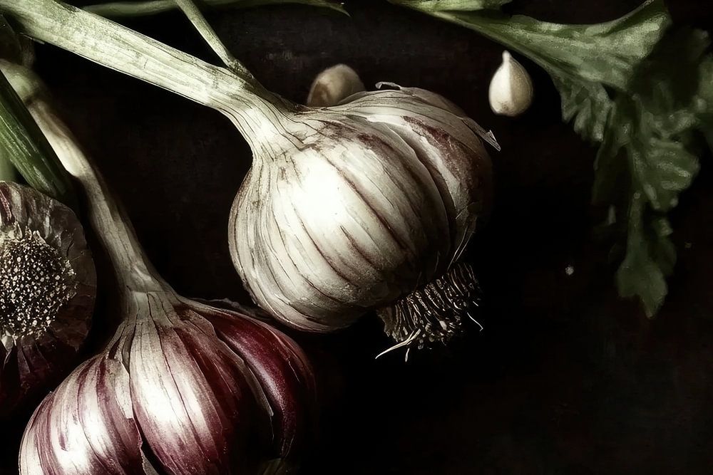 Ein elegantes und stimmungsvolles Stillleben, bei dem lila-weiße Knoblauchzwiebeln vor einem dunklen, rostigen Hintergrund subtil hervorgehoben werden. Die schlanken grünen Stängel wölben sich anmutig über die Bildfläche, während frische Petersilienblätter und einige abgetrennte Nelken die Szene vervollständigen. Die Komposition ist harmonisch und unaufdringlich und strahlt eine klassische Ruhe aus, die an die Malerei der alten Meister erinnert. Dieses Werk ist eine Ode an die Einfachheit, den Geschmack und die natürliche Schönheit - perfekt für kulinarische Interieurs, rustikale Küchen oder Liebhaber zeitloser Food Art.