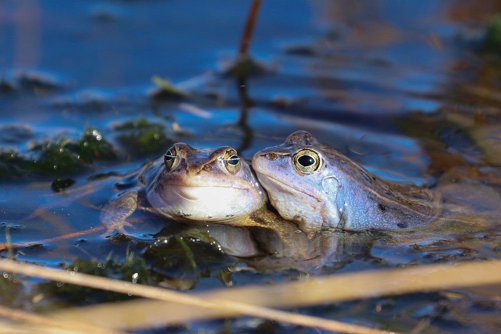 Der linke Frosch zeigt die halbtransparente Augenmembran, die Frösche hauptsächlich unter Wasser zum Schutz benutzen.