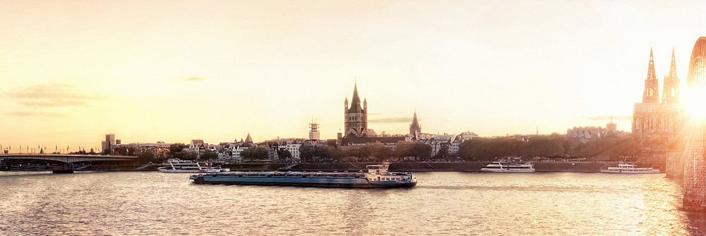 Panoramasicht auf den Rhein in Köln mit Hohenzollernbrücke und Kölner Dom im Sonnenuntergang