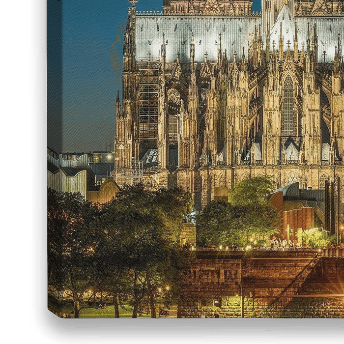 Blauer Himmel, goldener Schein. Der Kölner Dom in dem Licht der blauen Stunde. Seine gotischen Formen erheben sich erhaben, ein leuchtendes Juwel in dem sanften Licht der Dämmerung.