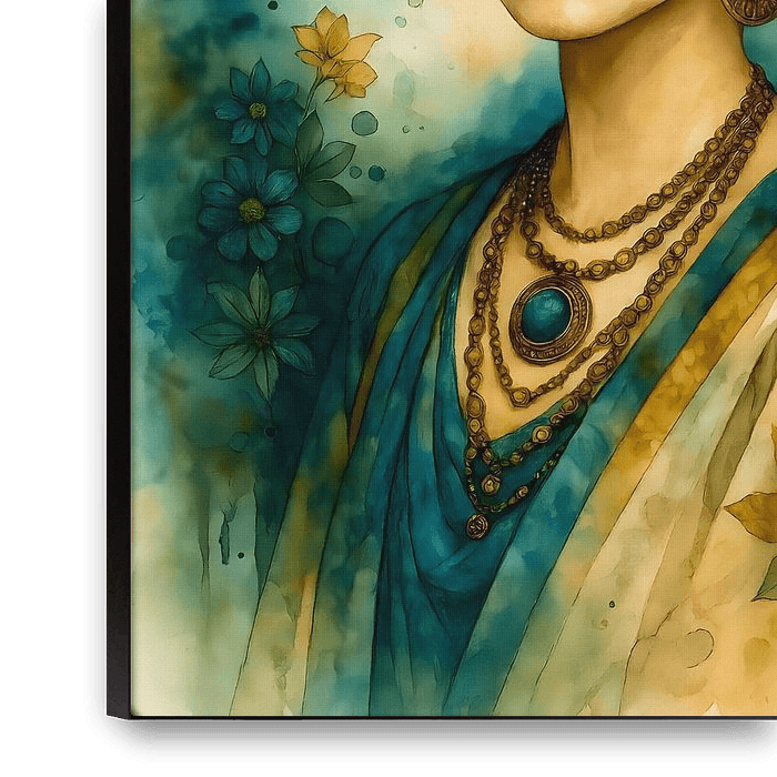 Ein elegantes Porträt einer Frau mit strahlendem Blumenschmuck in Blau und Gelb, ergänzt durch goldene Schmuckelemente und fließende Stoffe. Die Aquarellstruktur verleiht dem Bild eine sanfte, träumerische Tiefe, während die floralen Details eine natürliche Leichtigkeit einbringen.