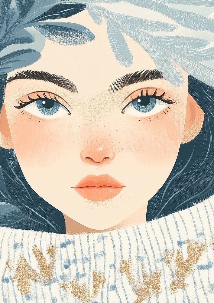 Eine moderne Illustration einer Frau mit Haaren, die feinen, winterlichen Zweigen ähneln und in sanften Grau- und Blautönen gehalten sind. Sie blickt geradeaus, mit einem ruhigen, aufmerksamen Blick, der sofort anziehend wirkt. Sie trägt einen warmen, gemütlich wirkenden Rollkragenpullover mit verschlungenen Mustern in gedeckten Weiß-, Blau- und Beigetönen. Kleine goldene Akzente verleihen ihrem Outfit einen Hauch von Eleganz. Der Hintergrund ist hell und hat Pastelltöne, die eine minimalistische Winteratmosphäre hervorrufen, mit einem Hauch kühler, eisiger Farbe, die dem Ganzen eine heitere Einfachheit verleiht.