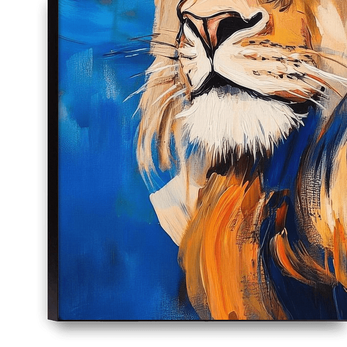 Majestätisch thront der Löwe im strahlenden Blau, seine goldene Mähne flutet wie eine königliche Aura um ihn. Die Krone auf seinem Haupt symbolisiert nicht nur Macht, sondern auch Anmut. Seine durchdringenden Augen strahlen Weisheit und Stärke aus, während der lebendige Pinselstrich das Bild mit Energie und Dynamik erfüllt. Ein wahrer…