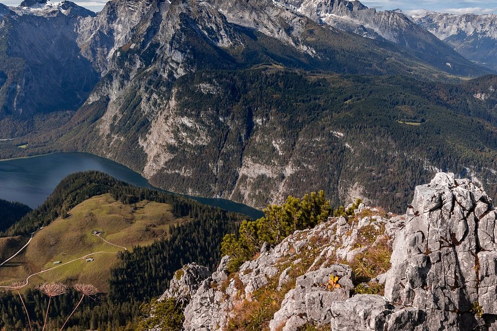 Blick auf den Königssee und das Watzmann-Massiv vom Gipfel des Jenner im Berchtesgadener Land, Bayern, Deutschland.