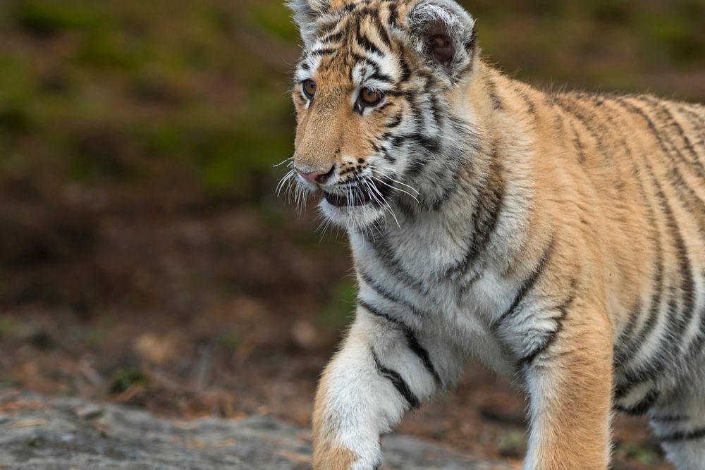 Royal Bengal Tiger / Koenigstiger ( Panthera tigris ), walking over rocks, on silent paws, full body, frontal side view, young animal, soft light.