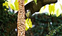 Im Winter tut man den Vögeln mit einer Schnur Erdnüsse einen großen Gefallen. Kleine Meisen tun dem Fotografen mit einer akrobatischen Pose einen Gefallen.