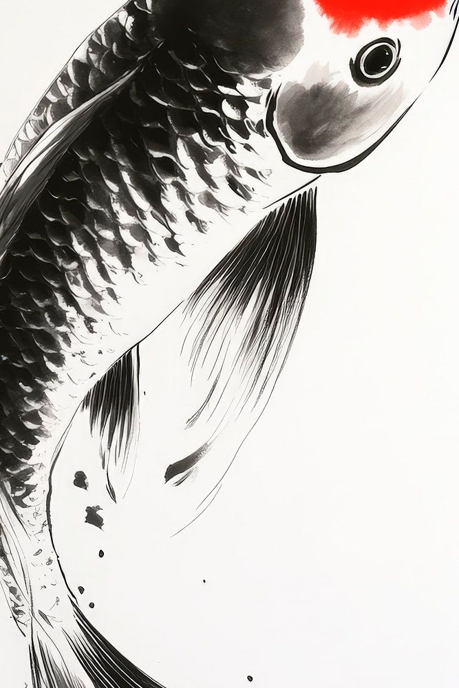 Ein majestätischer Koi mit strahlend rotem Punkt und eleganten, fließenden Linien zieht die Blicke auf sich und verleiht jedem Raum eine harmonische Aura. Die monochrome Komposition bringt Ruhe und Stil, ideal für das Wohnzimmer oder eine kreative Nische im Büro, wo Inspiration gedeihen kann.