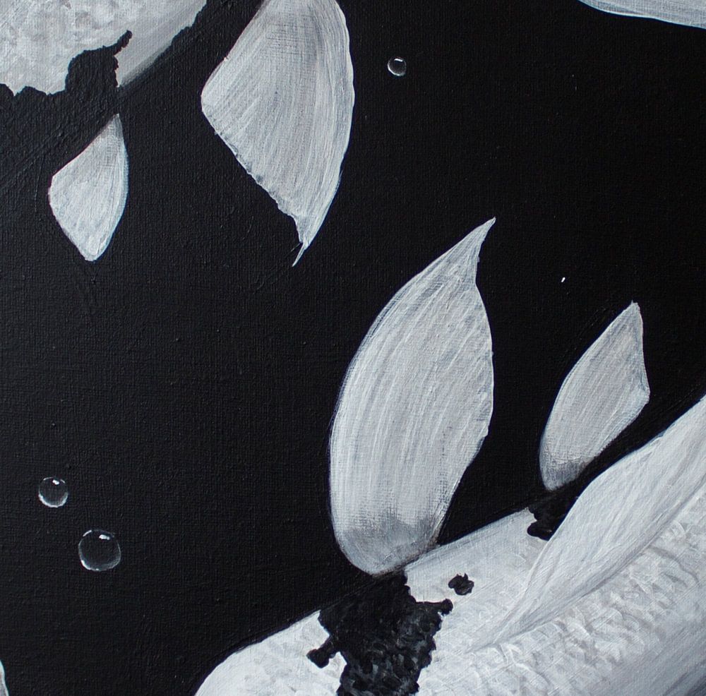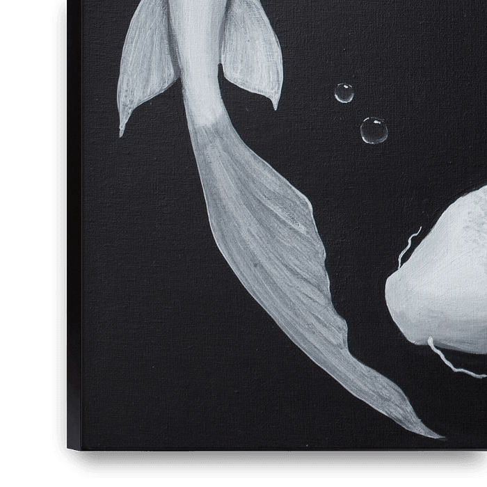 Dieses Gemälde strahlt sofort eine große Zen-Atmosphäre aus, wirkt aber gleichzeitig auch ein wenig geheimnisvoll. Zwei Kois, die sich in einer Art ruhigem Kreis umeinander bewegen, fast so, als würden sie ihre eigene kleine Welt bilden. Der dunkle Hintergrund lässt die Fische wirklich hervortreten, sodass der Blick automatisch ihren…