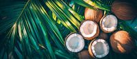 Bestelle das Foto Kokosnüsse mit Palmenblättern – Tropisch von Poster Art Shop als Reproduktion auf Leinwand, Alu-Dibond, als Poster, Fototapete oder Acrylglasbild.
