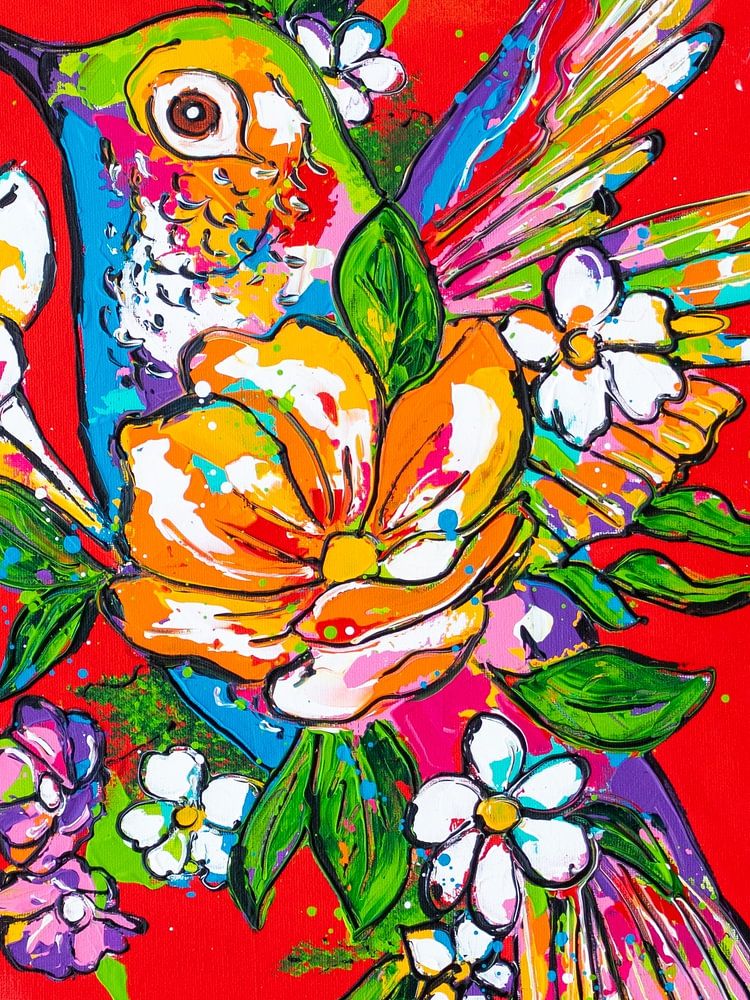 Bunter Kolibri mit Blumen von der Künstlerin Renate Rolefes. Das Originalbild ist 60 x 80 groß und mit Acrylfarbe gemalt.
