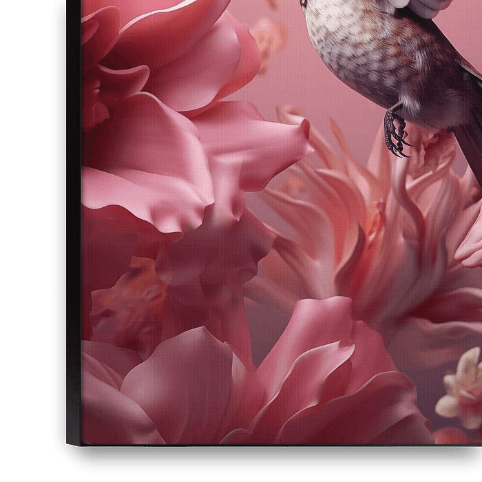 Bestelle dieses Blumen-Wandbild Kolibri mit rosa Blüten von Danny van Eldik - Perfect Pixel Design als Reproduktion auf Leinwand, Alu-Dibond, als Poster, Fototapete oder Acrylglasbild.