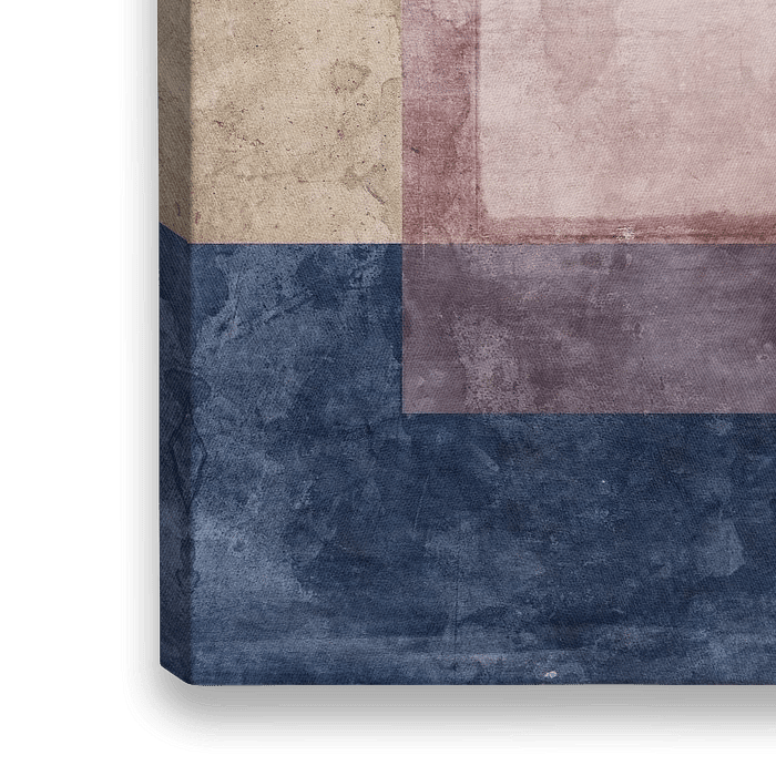 In der Mitte erscheint eine verwitterte Tür vor einem Hintergrund aus strukturierten Papieroberflächen in gedämpften Tönen - Blau, Sandbeige und Altrosa. Die Komposition besteht aus einer Mischung abstrakter geometrischer Formen und hat eine "verwitterte" Vintage-Ästhetik. Was passiert, wenn Sie durch die Tür treten?