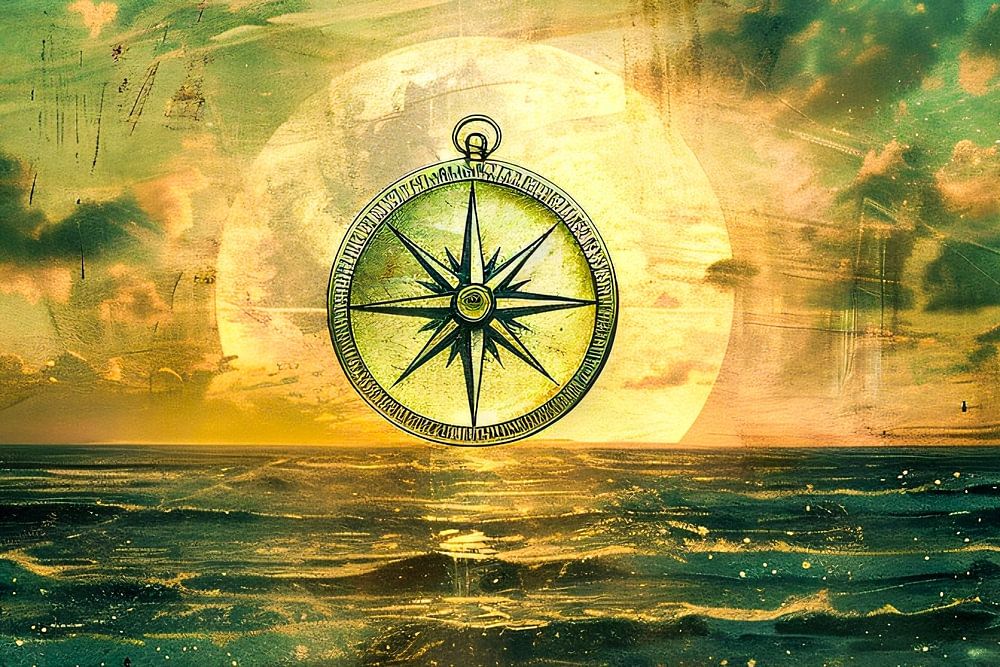 Dieses wunderschöne Design verbindet eine geheimnisvolle Atmosphäre mit künstlerischem Flair. Das Bild zeigt einen Kompass, der bei Sonnenuntergang über einem goldenen Meer zu schweben scheint, umgeben von einem dramatischen Himmel mit warmen Tönen und wellenförmigen Strukturen. Die surrealen Elemente machen es zu einem perfekten Kunstwerk für Liebhaber von modernen und abstrakten Designs. Dieses Werk verleiht jedem Raum einen Hauch von Geheimnis und Inspiration. Ideal als Blickfang im Wohnzimmer, im Büro oder im Kreativbereich.