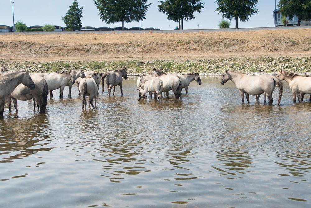 Afkoeling zoekende konik paarden staan in de rivier.
