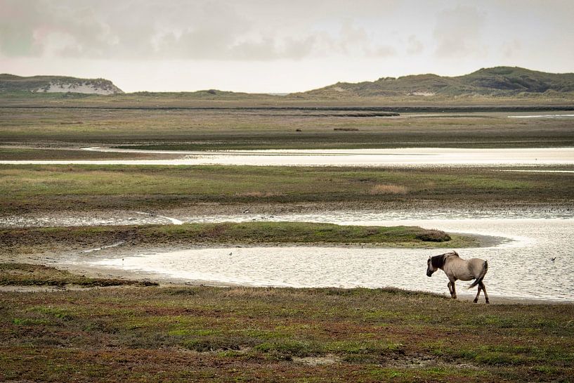 Vom Aussichtspunkt am Het Diepe Gat auf Texel können Sie auf das Meer hinausschauen. Bei Sonnenuntergang kamen ein paar Konik-Pferde angerannt. Die Landschaft wirkt trostlos und erinnert an Island.