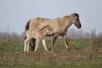 Bestelle das Foto Konik Pferd mit Fohlen von John Kerkhofs als Reproduktion auf Leinwand, Alu-Dibond, als Poster, Fototapete oder Acrylglasbild.