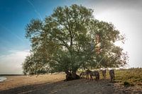 Tegenlicht foto van een groepje Konik-paarden onder een vrijstaande wilgen boom