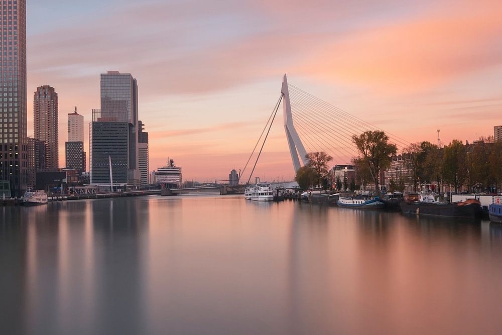 Rotterdams Koningshaven bei Sonnenaufgang mit den Türmen von Maastoren und Zalmhaven im Hintergrund.