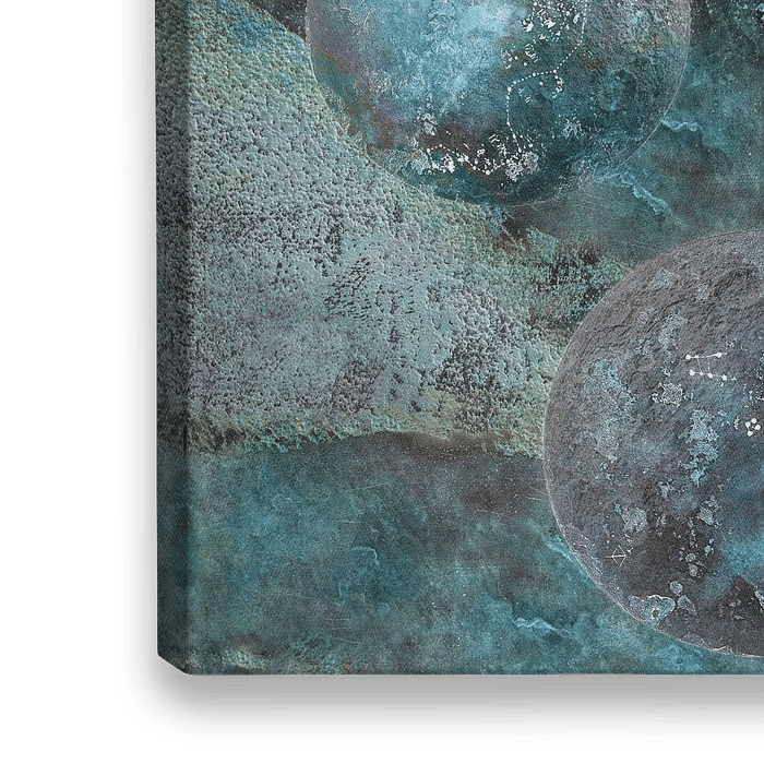 Abstrakte Kunst in hauptsächlich grünen, blauen und violetten Tönen mit einer Collage aus großen Fantasieplaneten mit Konstellationen.
