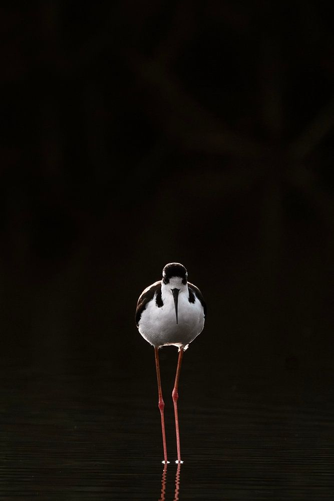 Dieses Bild mit dem Titel "Kontemplation im Kontrast" zeigt einen Stelzenläufer beim Baden in der Dämmerung, aufgenommen vor einem tiefdunklen Hintergrund. Das subtile Licht, das den Vogel und seine Reflexion auf der stillen Wasseroberfläche hervorhebt, schafft eine Atmosphäre tiefer Kontemplation. Die roten Beine des Vogels fügen der überwiegend dunklen Farbpalette einen ruhigen, aber kräftigen Farbakzent hinzu. Dieses Werk strahlt eine mystische Ruhe aus und würde jede Sammlung mit einem starken visuellen Interesse bereichern.
