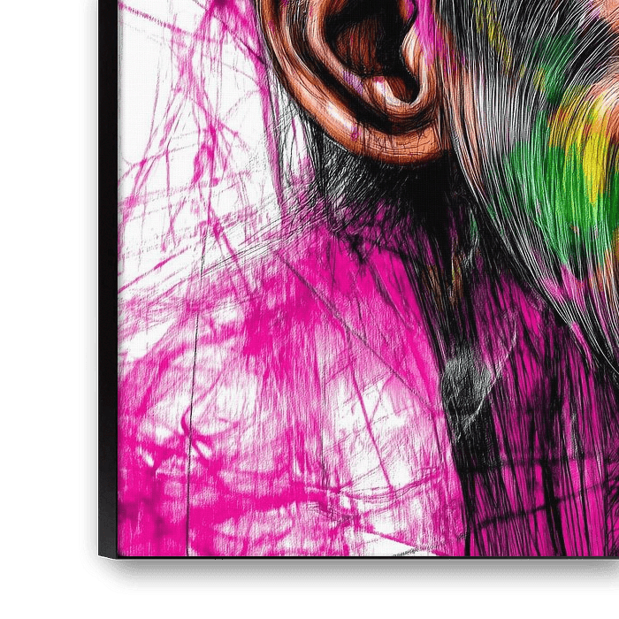 "Kontemplation in Farbe" ist eine lebendige und mutige Illustration eines Affen mit einem verspielten und doch introspektiven Blick. Die Verwendung von leuchtenden Farben und dynamischen Linien schafft einen starken visuellen Kontrast zum minimalistischen Hintergrund und macht die Figur zum Mittelpunkt der Komposition. Der Affe mit dem ruhigen Blick und der großen Brille scheint tief in Gedanken versunken zu sein, während die bunten Farbstreifen um seinen Kopf die Energie und Komplexität seiner Gedanken symbolisieren. Die Details des Gesichts und die Textur des Fells sind fein ausgearbeitet und vermitteln ein Gefühl von Tiefe und Realismus, während die Farbausbrüche ein Gefühl von Freiheit und Dynamik vermitteln. Die Farben reichen von leuchtenden Pink- und Gelbtönen bis hin zu kräftigen Grün- und Blautönen und unterstreichen die Lebendigkeit und Energie des Werks. Diese Illustration erforscht den Kontrast zwischen dem ruhigen, nachdenklichen Ausdruck des Affen und der wilden, ungezähmten Energie der ihn umgebenden Pinselstriche und lädt zum Nachdenken über die Komplexität der Gedanken und Gefühle ein. Das Werk unterstreicht die Schönheit der Selbstreflexion und lässt die Grenzen zwischen Tier und Mensch verschwimmen, indem es einen spielerischen und doch tiefgründigen Zugang zu menschlichen Gefühlen bietet.
