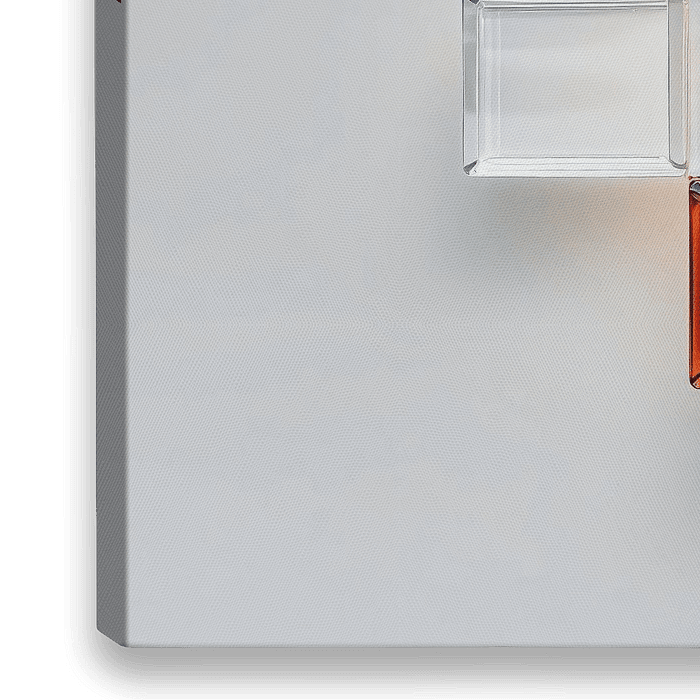 Diese Komposition vereint geometrische Klarheit mit einer subtilen Farbnuancierung. Vier transluzente Glaswürfel, angeordnet in einer symmetrischen Kreuzform, umgeben ein zentrales, leuchtendes Element. Die Farbpalette aus klarem, warmem Orange und sattem Grün schafft eine harmonische Balance zwischen Natürlichkeit und moderner…
