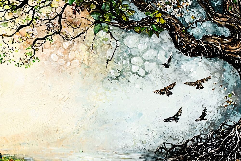 Dieses Kunstwerk zeigt die zwei Gesichter der Natur: Leben und Verfall. Auf der einen Seite erblüht eine bunte Landschaft mit Blumen, einem Fluss und einer frischen, hellen Atmosphäre. Auf der anderen Seite zeigt es dunkle Elemente wie kahle Wurzeln und Schädel, die Verfall und Geheimnis symbolisieren. Perfekt als Wanddekoration für alle, die tiefgründige und eindrucksvolle Kunst lieben. Es bringt Kontrast und eine Geschichte in jeden Raum.
