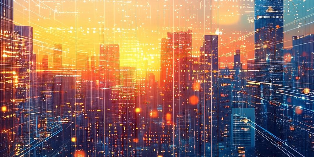Das konzeptionelle Panorama einer Stadtsilhouette, beleuchtet vom Schein der Neonlichter und Elementen der digitalen Welt, fängt die Energie des städtischen Lebens ein.