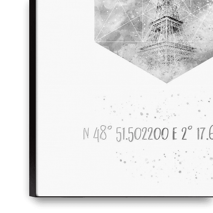 Bestelle dieses abstrakte Wandbild Koordinaten PARIS Eiffelturm | Aquarell Monochrom von Melanie Viola als Reproduktion auf Leinwand, Alu-Dibond, als Poster, Fototapete oder Acrylglasbild.