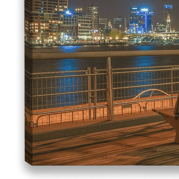 Avondopname met lange sluitertijd op de kop van zuid in Rotterdam met op de achtergrond de Erasmusbrug.