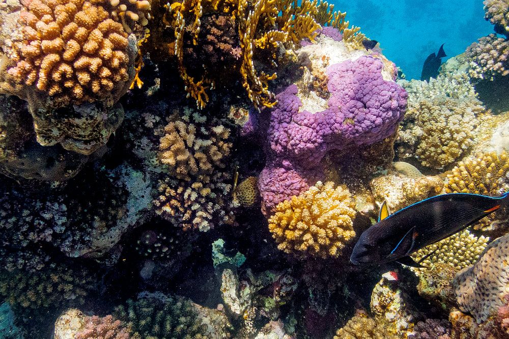 Koraalberg op de rand van het rif dak en de diepere zee. Het kenmerkt zich door de vele kleuren en de grote variatie aan vissen. Op de foto is ook een Rode Zee Doktersvis te zien. Foto is gemaakt in Marsa Alam bij het huisrif van hotel Three Corners Fayrouz.