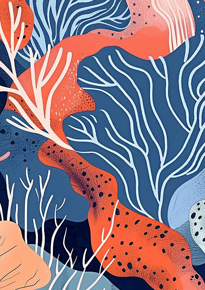 Koralle, im Stil des organischen Surrealismus. Durch die Verwendung von Schablonen und einer Farbpalette aus Blautönen wird eine Atmosphäre der Wiederholung von Formen geschaffen.