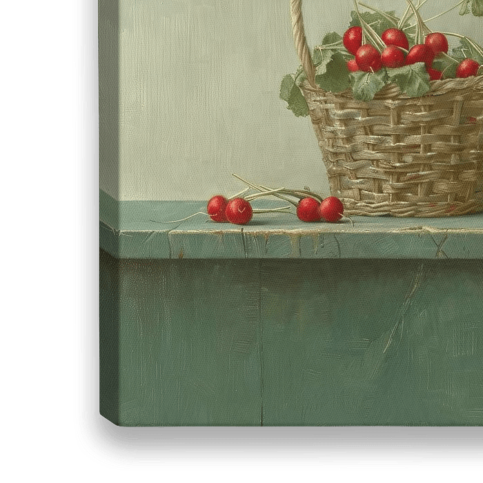 Basket of Summer Reds - Dieses Stillleben zeigt einen geflochtenen Korb, der mit leuchtend roten Kirschen gefüllt ist, die auf einem gedämpften grünen Hintergrund ruhen, der sich von einem sanft strukturierten, hellen Hintergrund abhebt.