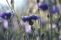 Schöne wilde blaue Kornblumen, blühend auf einer Sommerwiese, im Gegenlicht der warmen Abendsonne. Unscharfer Bokeh-Hintergrund. Romantische Wildblumen Natur Kunst.