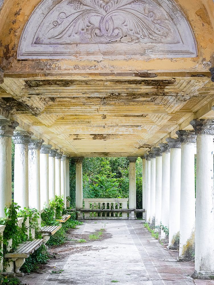 Dies ist ein Bild eines schönen, baufälligen Korridors in einem verlassenen Bahnhof in Abchasien. Abchasien ist ein Land, das nicht offiziell anerkannt ist. Der Besuch des Landes war daher eine ziemliche Herausforderung, was dieses Bild umso besonderer macht.