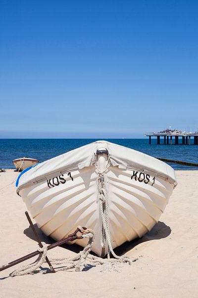 Weisses Boot am Strand liegend, im Hintergrund die Seebrücke, Koserow, Insel Usedom, Mecklenburg-Vorpommern, Deutschland