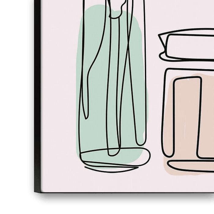 Eine Sammlung von Tiegeln, Flaschen und Tuben, gefüllt mit schönen Farben von Kosmetika. Ein lustiges Werk für das Badezimmer, das Wartezimmer, das Spa, die Sauna, den Salon, die Pediküre oder das Schlafzimmer. Ich habe dieses Werk in Adobe Illustrator gezeichnet. Jeder Tiegel und jede Flasche ist mit nur einer durchgehenden Linie gezeichnet, auch Einlinienzeichnung genannt.